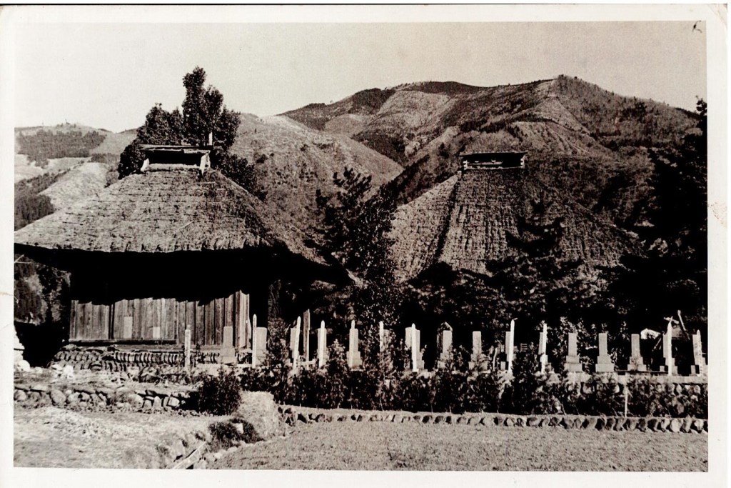 ざっとではありますが、大明神と御祖師様の出会いはこのようのなお話が残っています。この七面大明神さまのご分体を妙久寺にも当山の第23世耆全院日慧上人(1760年頃)が勧請しました。以来檀信徒の外護のもと信仰をつないでまいりました。偶然アルバムを整理していたところ戦後の古い写真を見つけました。その当時の茅葺き屋根の姿が見られます。