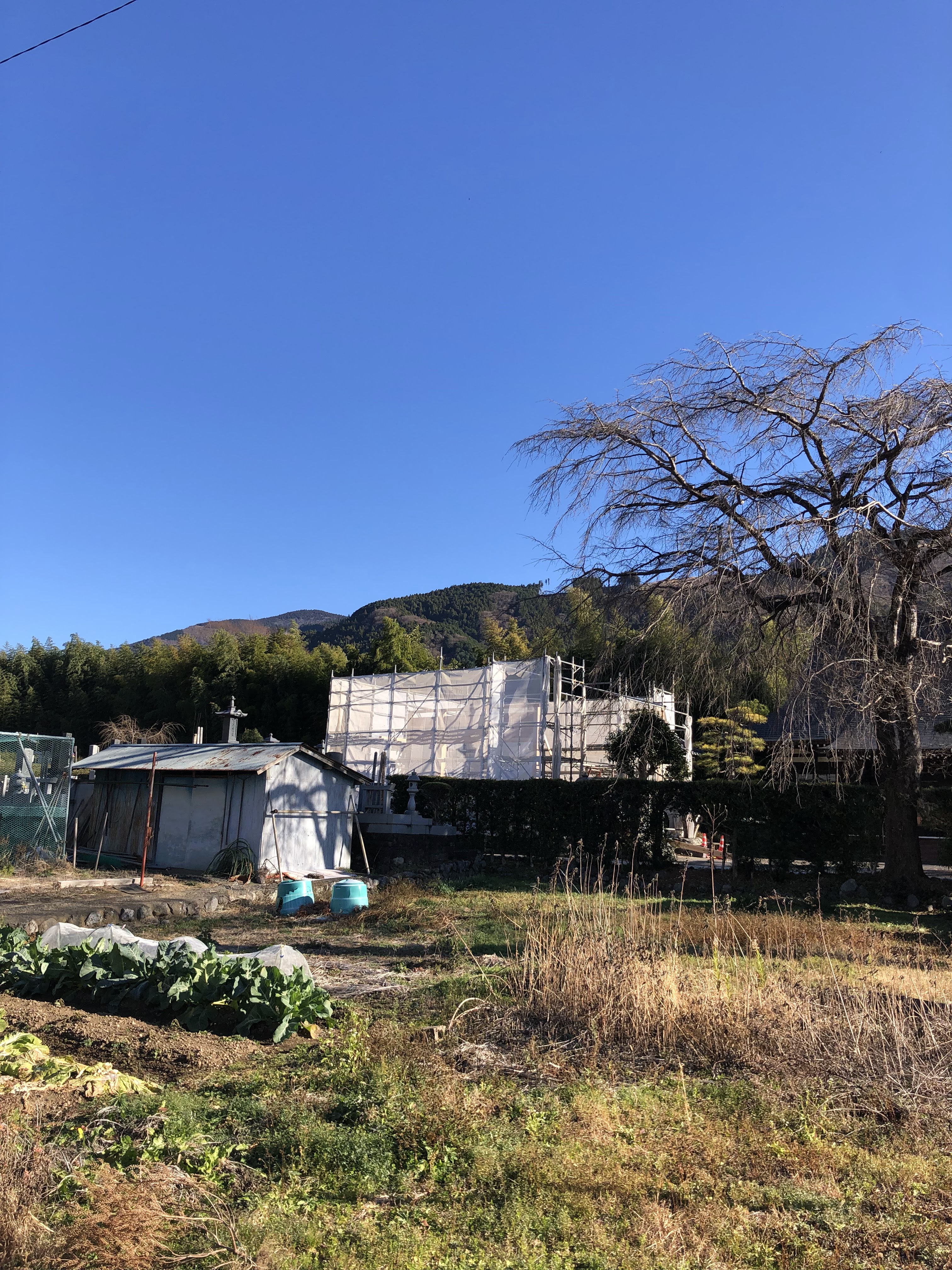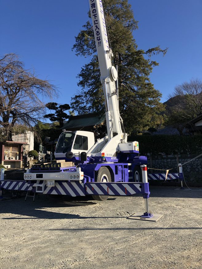 心配されていた雨もなく、少し風が出ていたのでクレーンの作業が不安でしたが無事に工程を進んでいます。大工さんとしては雨が降ってしまうと作業に遅延がでるし、材木にもよくない。またクレーン車にしてみれば風があると扱いが難しくなる。また驚いたのはあのでっかいクレーン車がよく境内まで入ってこれたなということです。