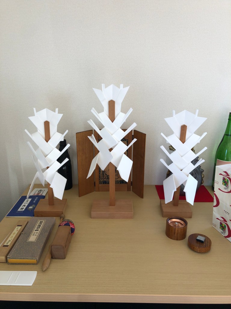 諸天を勧請(きていただき)して法味(お経を唱える功徳)を言上し祈念します。事務所に響くお経の声、木柾の軽快なリズム、カンカンっと鳴り響く木剣加持祈祷で関係者の皆様の事業繁栄、商売繁盛を祈願いたしました。