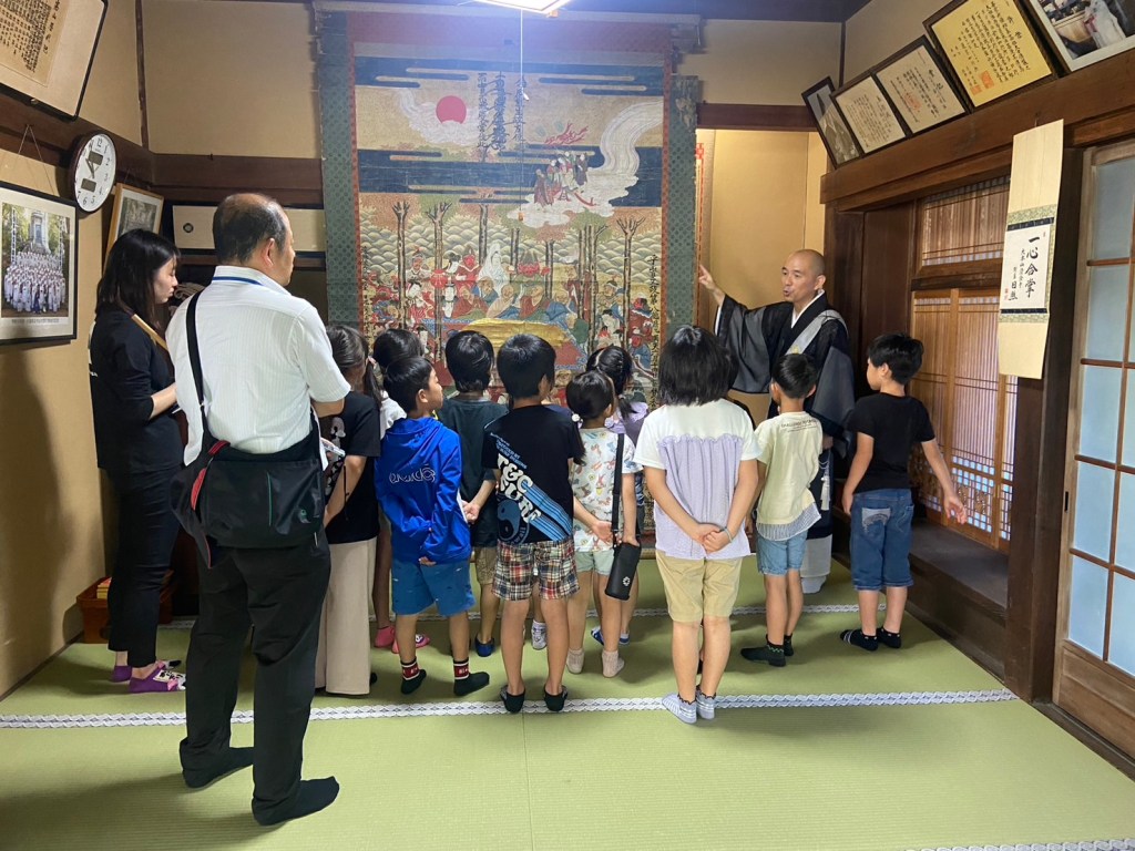 幸せに生きるいのりを続けてきた場所、生きている人と亡くなった人が交わる場所という切り口で説明をしました。また当山の寺宝である涅槃図を出して説明もしました。この写真の涅槃図は文政8年(乙酉)つまり1825年に収められたものです。今から200年前の絵を披露しました。また仏具や当山にある鐘楼堂にも案内して実際に仏具を使ってみたり鐘をついてもらいました。