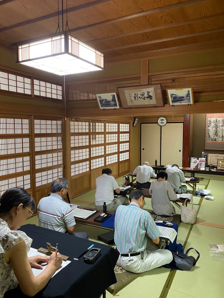 9時からの写経の会は想定していた人数より多く7人の参加となりました。拙寺には高い机と椅子が一つ揃いしかないので2人使用の長机で畳に正座で始まりました。時間は90分でしたがみなさん集中して筆を、筆ペンを進めていました。